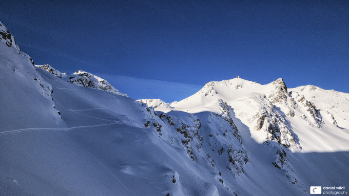 Ein paar wenige Skitourengeher sind den Steilhang Richtung Ritzitälli runter gefahren, ich habe mich für die Abfahrt via Aufsteigsroute entschieden...oben abgeblasen und dann alle 10-20 Meter wechselnde Verhältnisse, von 10-20cm Pulver auf guter Unterlage zu hart und abgeblasen und ab und an wohl über einen alten Lawinenkegel...etwas mühsam...der schönste Hang dann unterhalb der Steilstufe Richtung Wysse Bode, Chlusmatte