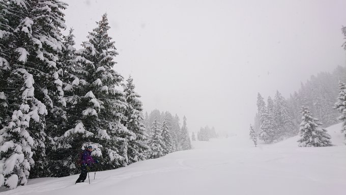 Wegen der vielen Bäume war die Sicht, trotz "schlechtem" Wetter, gut. Die ganze Route ist gut eingeschneit. Allerdings sind Weidpflöcke nur knapp mit ungebundenen Schnee überdeckt und lauern so als unsichtbare Stolperfalle auf Skifahrer.