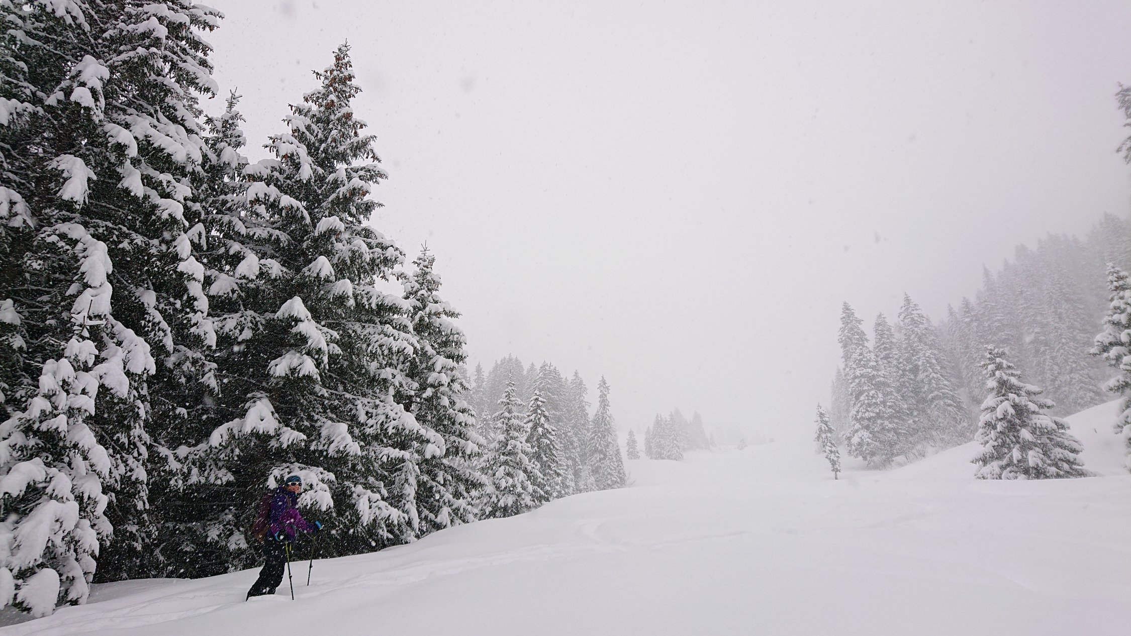 Der Wetterbericht prognostizierte viel Neuschnee und Niederschlag während dem ganzen Tag. Desshalb haben wir uns für diese einfache Tour entschieden. Das Gelände ist stark kupiert und durchschnittlich bis zu 25° steil.