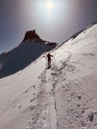 Vom Tal bis zum Skidepot harte, kompakte Schneedecke. Harscheisen nicht notwendig. Aufstieg zum Spitzmeilen gut machbar, auch ohne Steigeisen; ein Pickel kann jedoch hilfreich sein. Anschliessend kurzer Abstecher zum Wissmeilen.