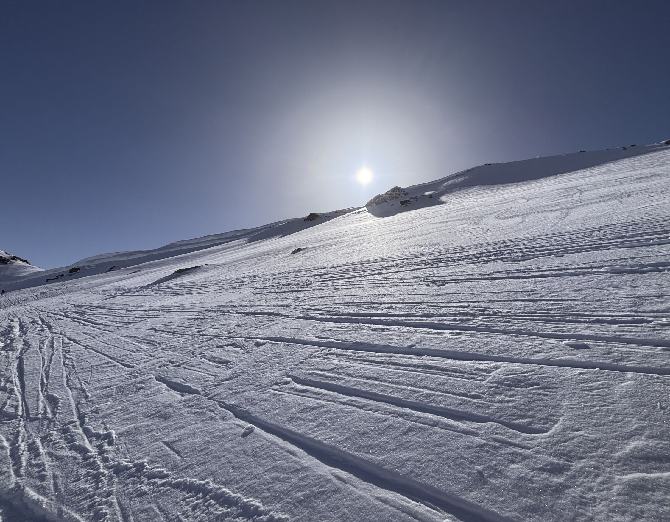 Abfahrt vom Wissmeilen ca. 1300 Uhr. Schnee sulzte nicht auf, bis zur Skipiste fast durchgehend gefrorene, kompakte Schneedecke. Trotzdem sehr schöne Abfahrt.