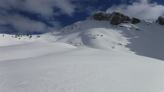 Tourenbeginn um 09:20 Uhr bei -7°C, morgens bedeckter Himmel, ab Mittag riss es auf und die Sonne kam immer wieder durch sich auflösende Wolken durch. Es lag eine Schneepulverschicht vor 20 bis 30 cm tief. Lediglich der Nordkamm zwischen P 1790 und Kreuz war abgeblasen und glasiert. Dessen Ostseite jedoch stark zugeweht, so dass ich mich im oberen Bereich meist westlich vom Bergrücken bewegte.