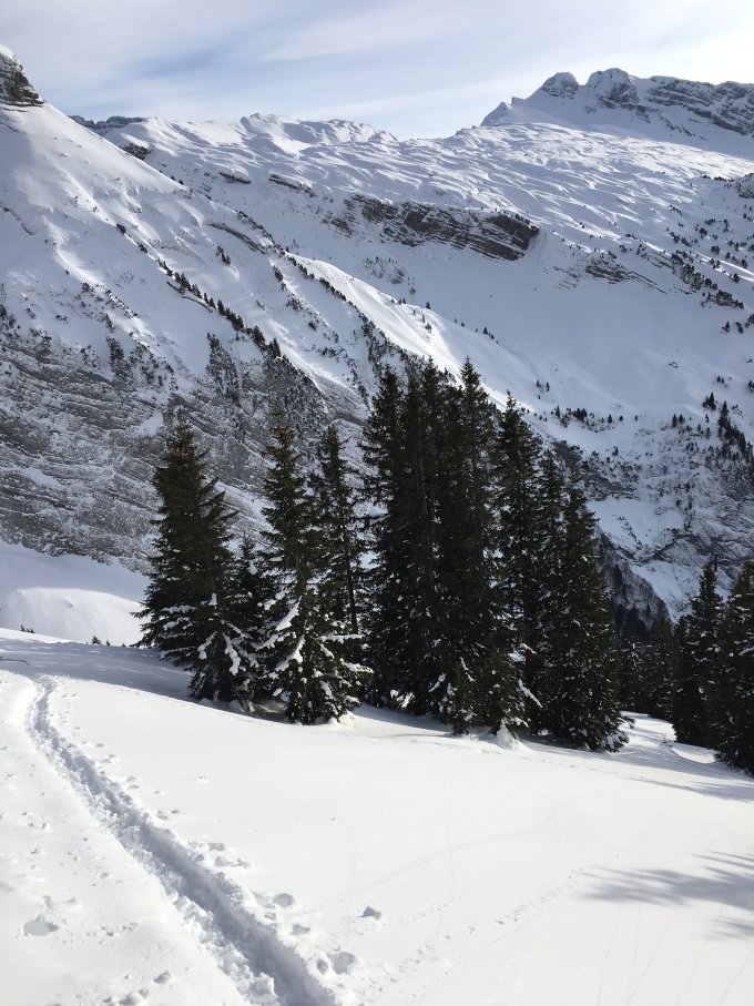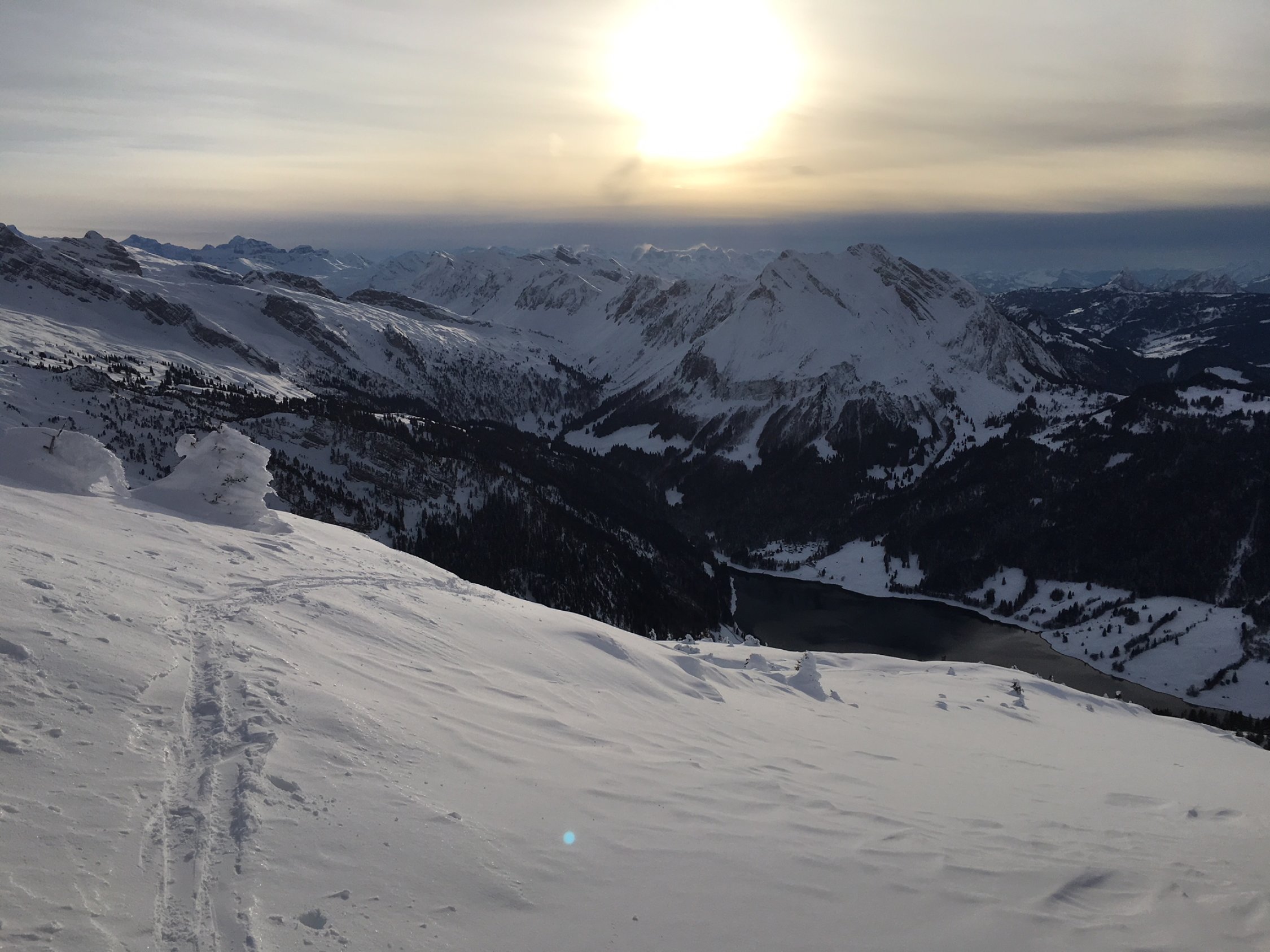 Abfahrt wie Aufstieg: Erst verblasen, ab 1900 dann Pulver mit Deckel, ab Alp feuchter Pulver, Almweg trockener Pulver