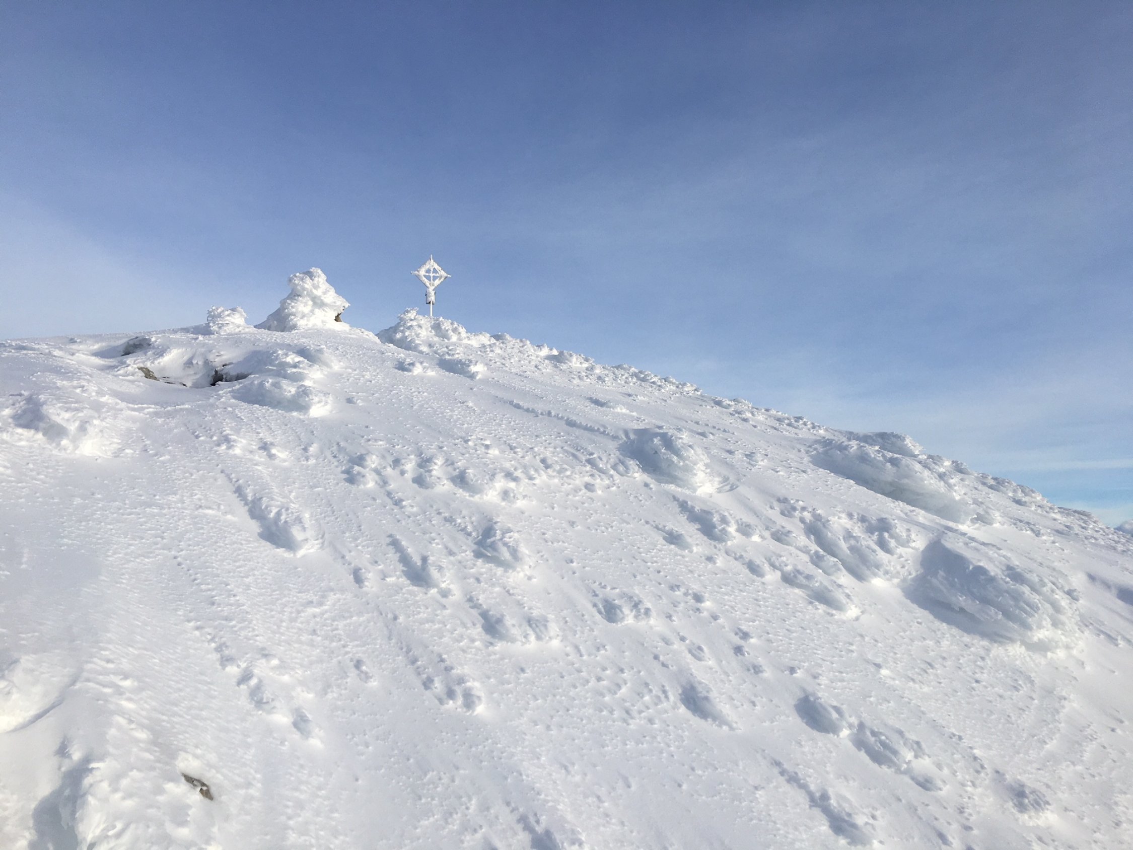 Aufstieg Skiroute 233b: Gespurt bis Alp Hohfläsch, ab da mit 30 Kehren gut angelegte aber verblichene Spur vom Dienstag neu zu spuren. Mit Ski bis zum Kreuz