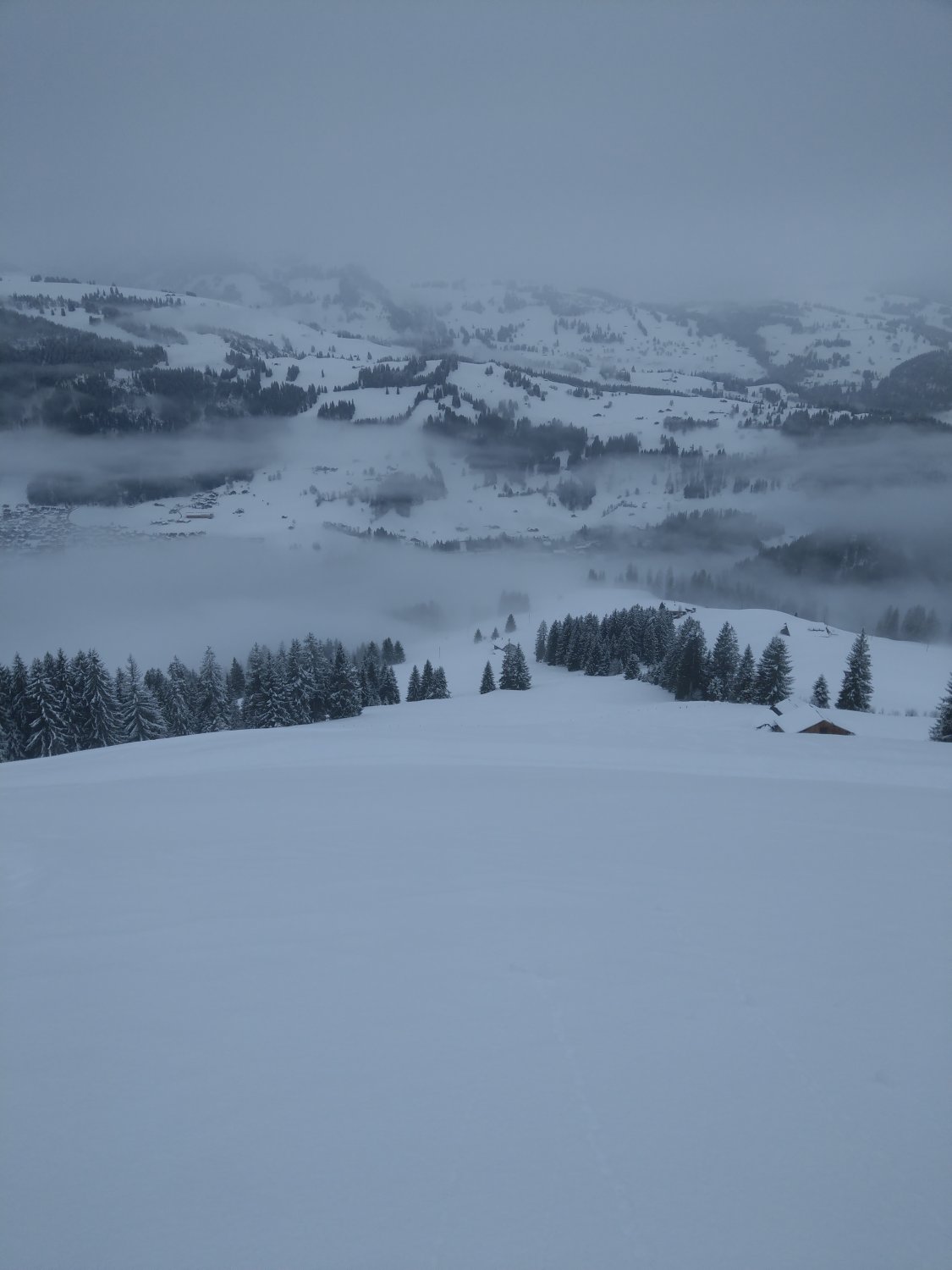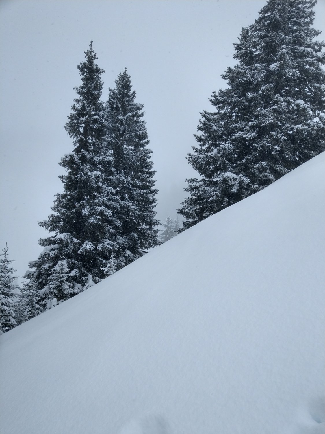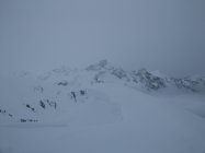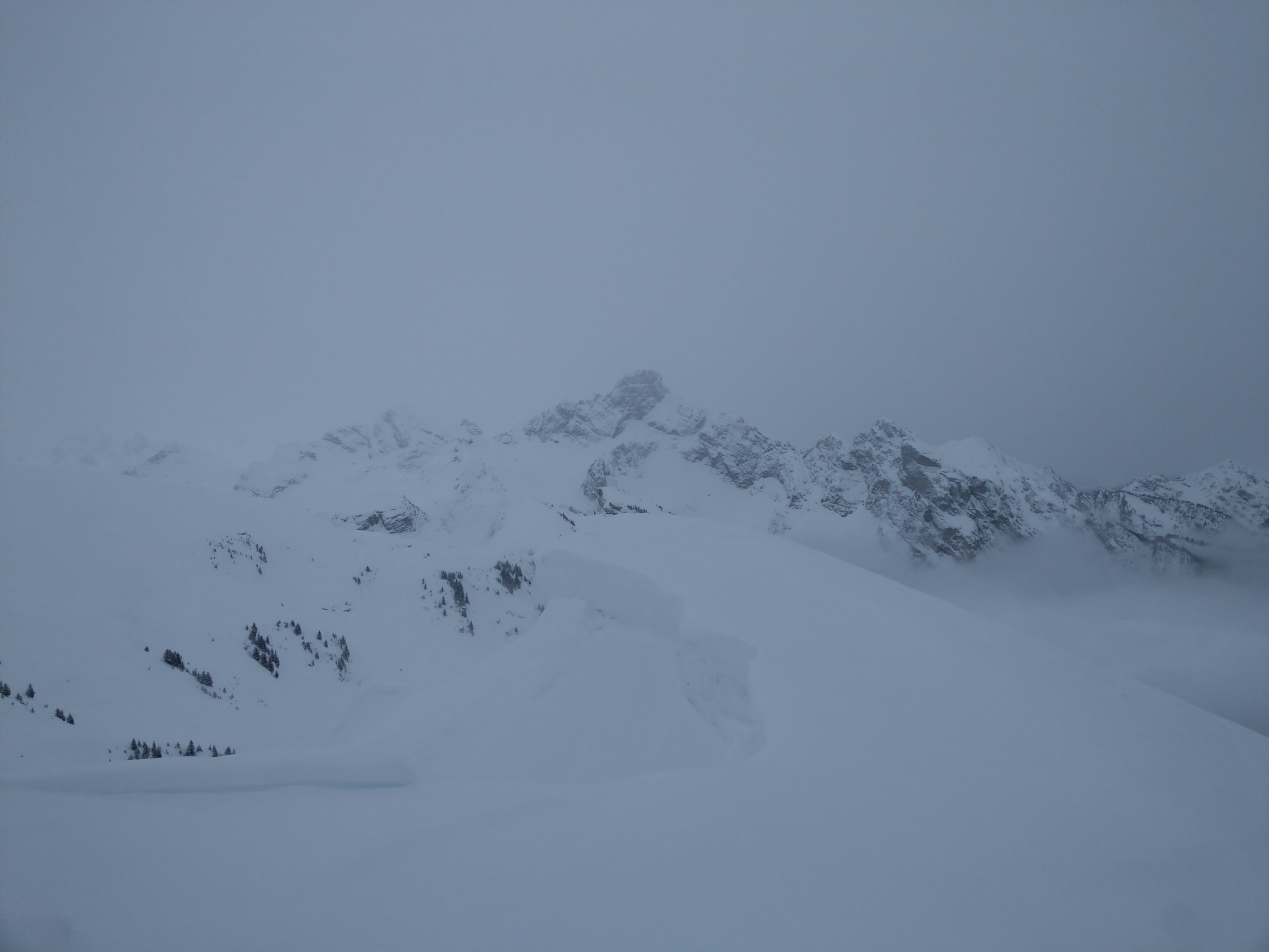 Heute allein im Gebiet. Den ganzen Vormittag hindurch dichter Schneefall oder Regen. Vom angekündigten stürmischen Föhn war nur auf dem Gipfel etwas zu spüren. Restlicher Aufstieg meist windstill. Gipfelhang abgeblasen, mit rund 10cm Neuschnee auf harter Unterlage. Weiter unten an windgeschützten Stellen lässt sich hingegen ein Stock ohne Mühe fast 1m eintreiben. Auf ganzer Tour keine Wumms oder Risse wahrgenommen. Abfahrt im Nebel durch knietiefen, eher schweren Pulver.