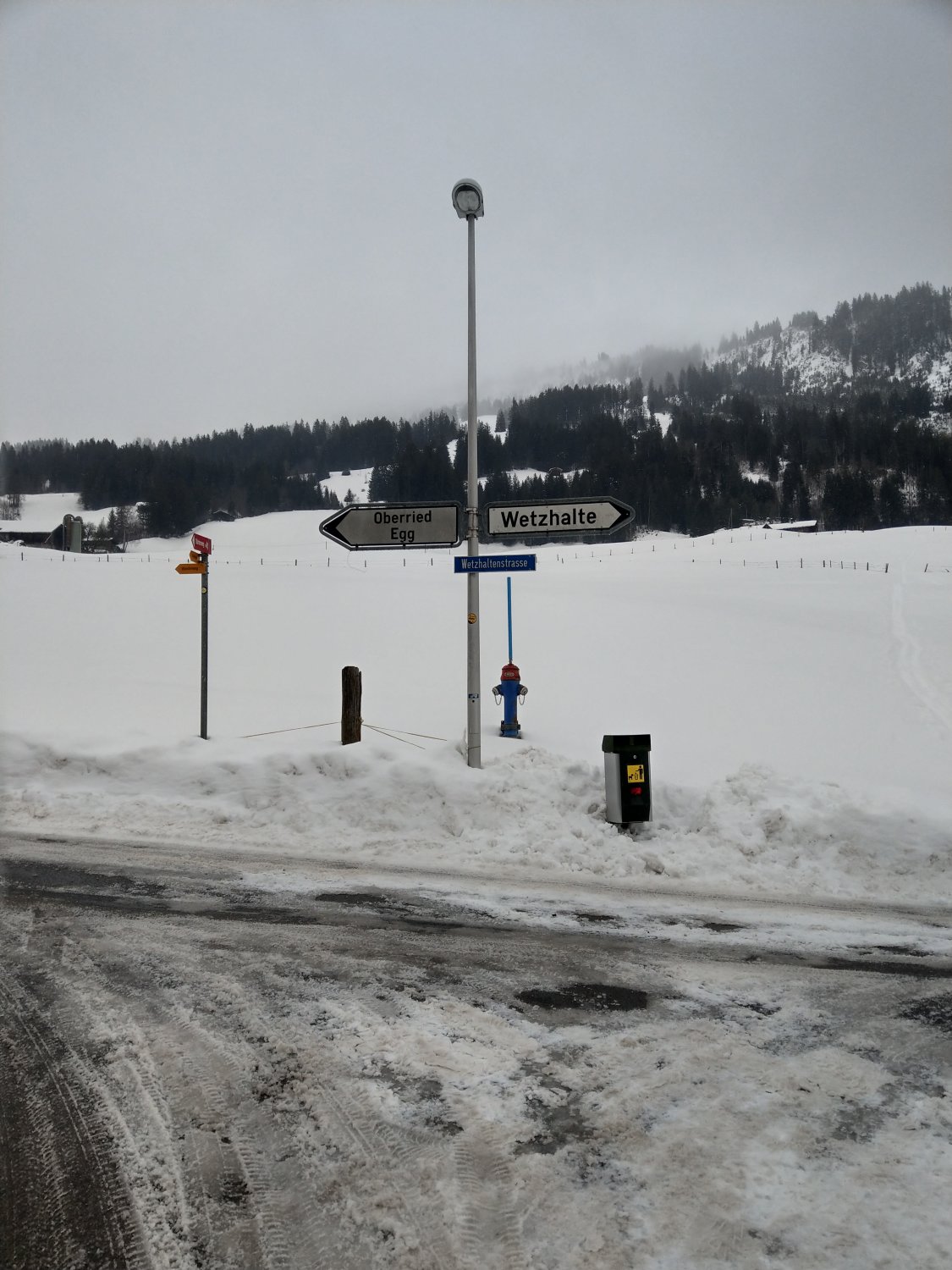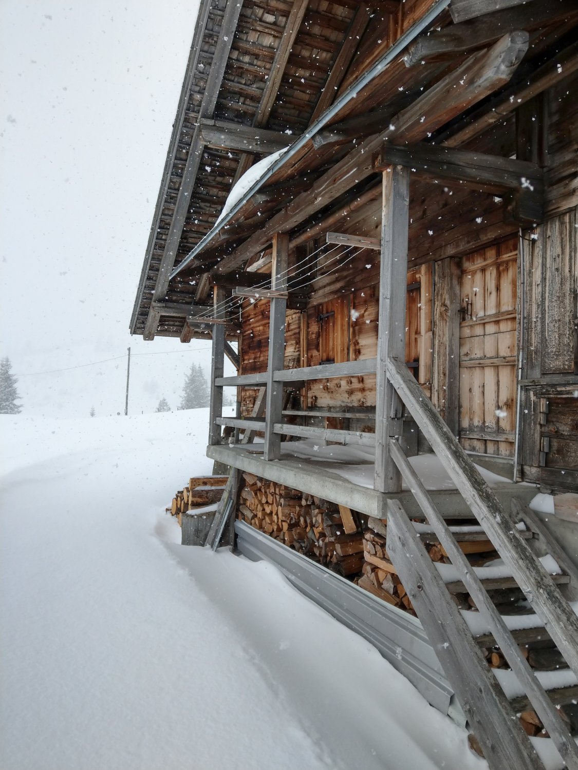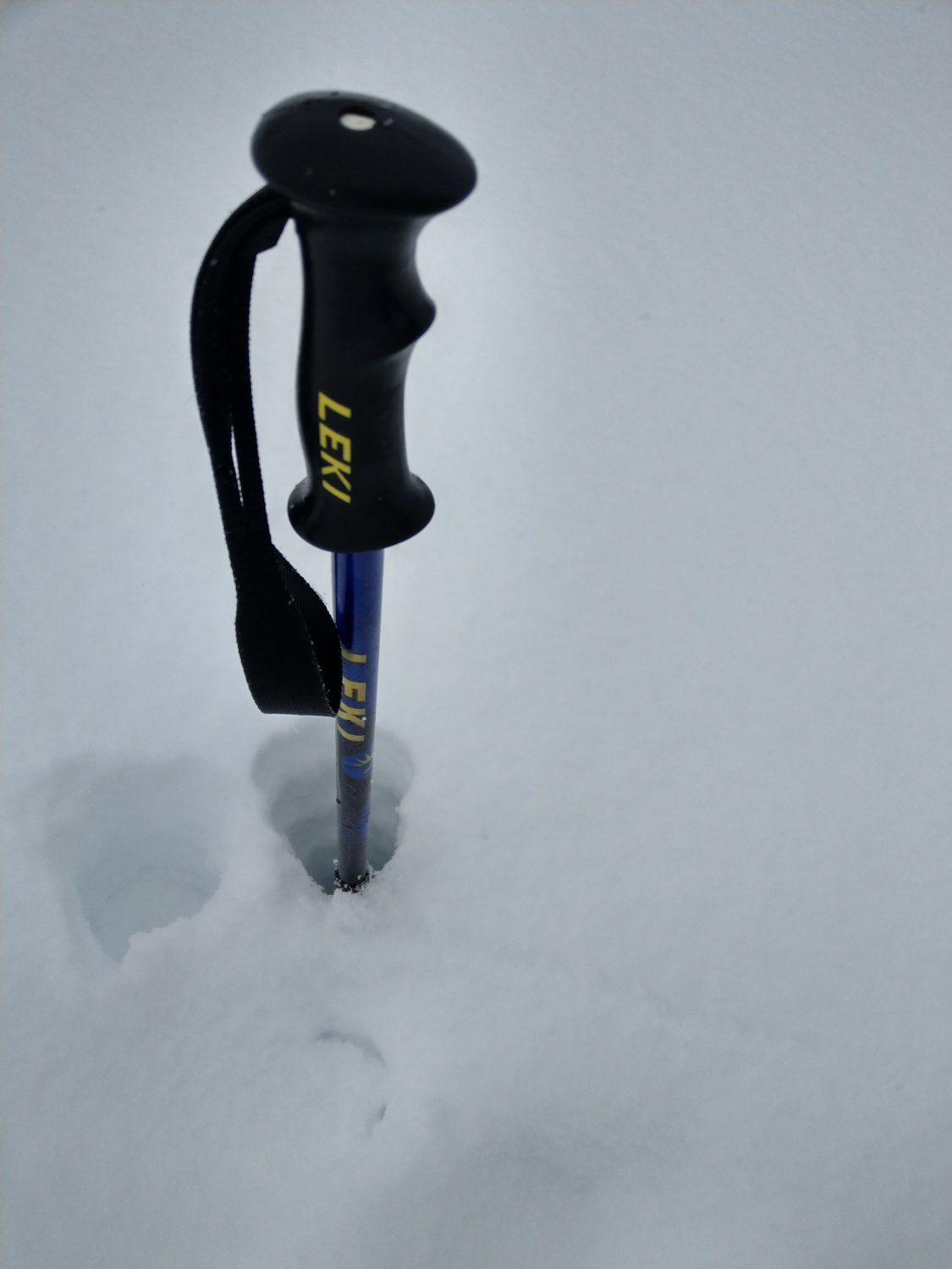Heute allein im Gebiet. Den ganzen Vormittag hindurch dichter Schneefall oder Regen. Vom angekündigten stürmischen Föhn war nur auf dem Gipfel etwas zu spüren. Restlicher Aufstieg meist windstill. Gipfelhang abgeblasen, mit rund 10cm Neuschnee auf harter Unterlage. Weiter unten an windgeschützten Stellen lässt sich hingegen ein Stock ohne Mühe fast 1m eintreiben. Auf ganzer Tour keine Wumms oder Risse wahrgenommen. Abfahrt im Nebel durch knietiefen, eher schweren Pulver.