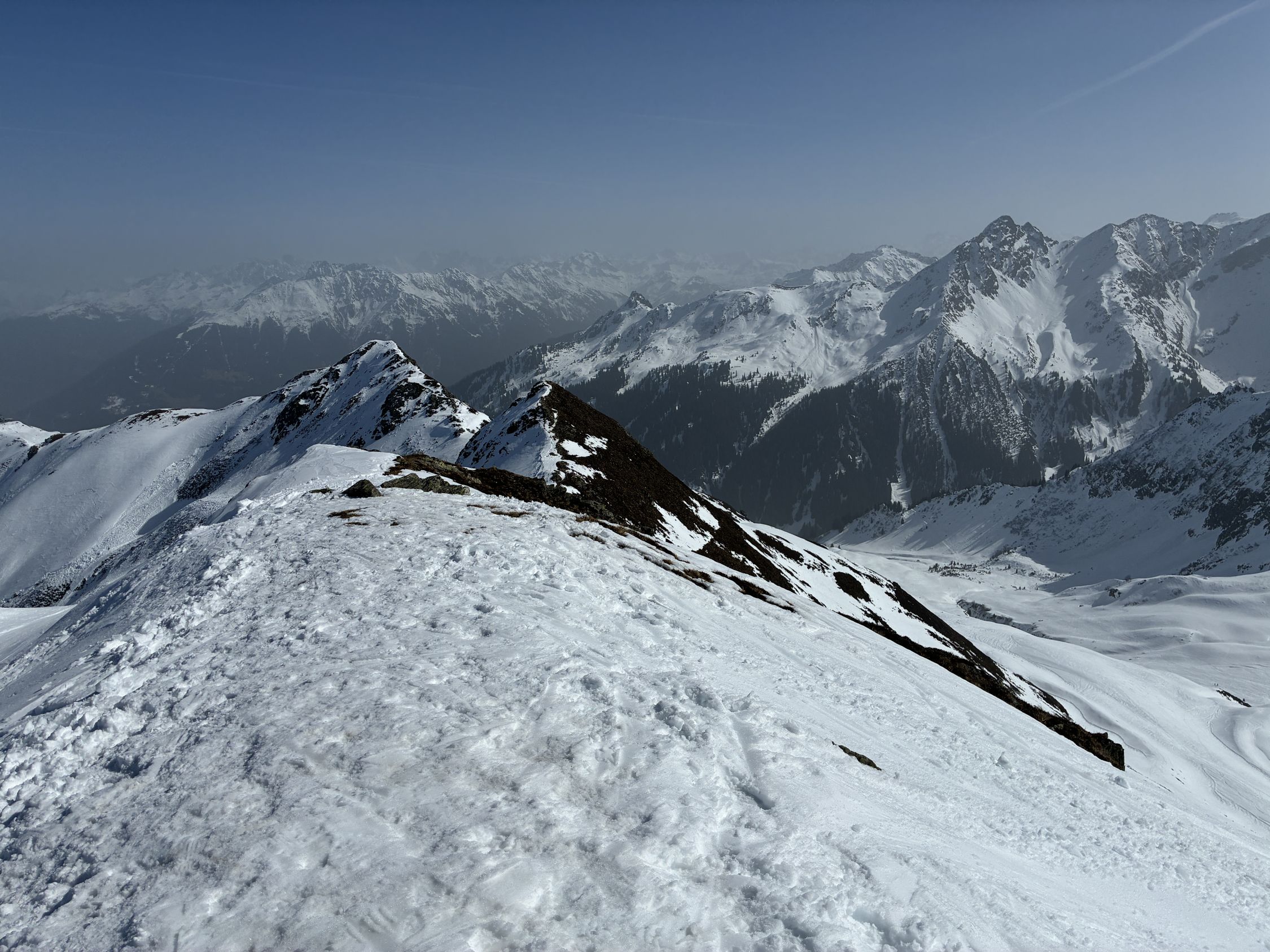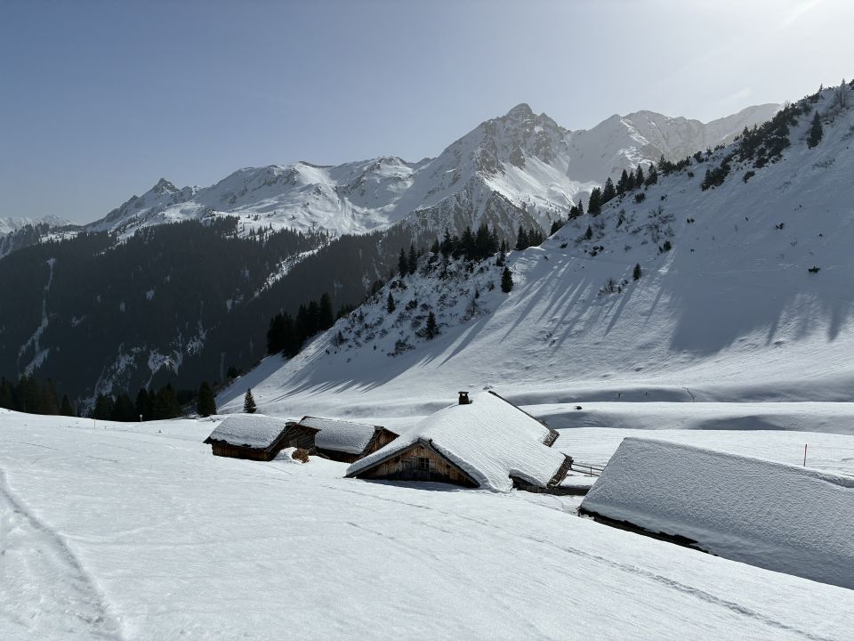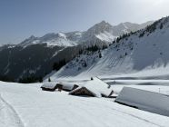 Ab Beginn der Rodelbahn Richtung Lindauer Hütte durchgehend Schnee. Vom Gipfel weg toller Sulz, super zum Fahren. Forstweg bzw Skiabfahrt 22 gut fahrbar. Sonst im Gebiet: Geissspitze ist der Aufstieg komplett von einer Lawine verschüttet, Übergang in den Süden sieht unangenehm aus. Aufstieg Kreuzjoch aus dem Skigebiet machbar aber sehr hart, Harscheisen nötig. Sehr einsamer Aufstieg.