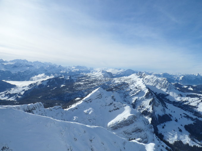Es soll ja noch mehr Schnee geben. Abfahrtsmässig ist die Tour derzeit nicht sehr interessant. Fast zu viel Schnee. Aber die Aussicht ins Mittelland und in die Berner Alpen ist phänomenal