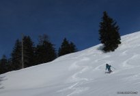 Abfahrt: Wir fanden nebenan noch feuchten, unverspurten Pulverschnee, schön zu fahren. Unten war's auf der Piste angenehmer als im verfahrenen Schnee nebenan.