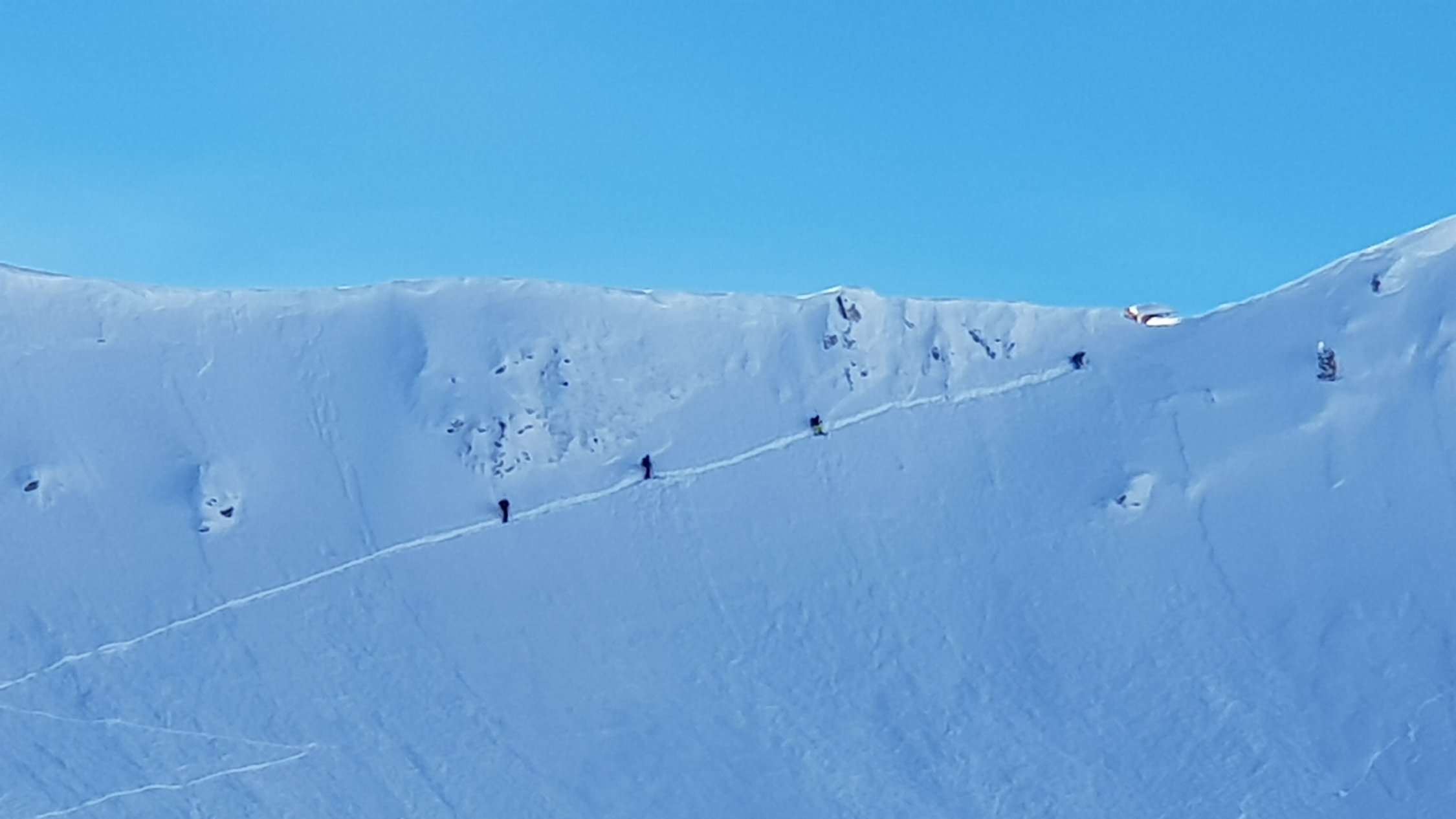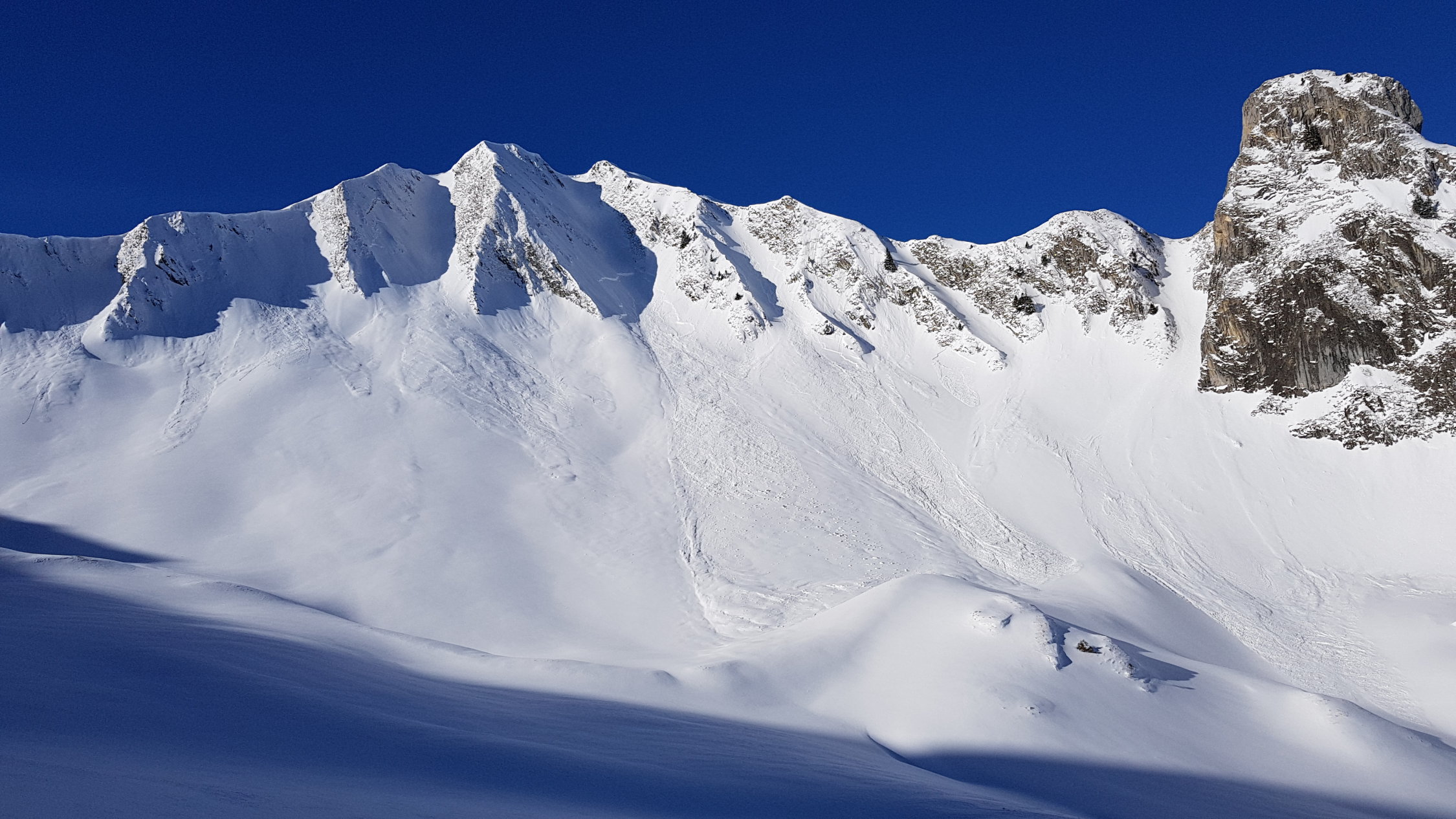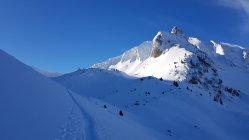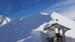 In der Früh war sehr wenig auf dem Parkplatz los. Nicht mal der Bire war verspurt. Um 10 sind erst die ersten Spuren dort gezogen worden. Heute hat eine Gruppe, welche auf die Schibespitze ging den Morgetenpassfrei gegraben. Ab Morgetenpass quasi ungespurt. Schnee bis zum Pass leicht windgepress. DDarunter Pulver. Der eine Skitourengeher hatte schmale Ski. Da haben die Ski von meinem Splitboard noch rein gepasst. Ab Morgetenpass Aufstieg im T-Shirt. Top Sicht und fast kein Wind. In (fast) allen Hängen schon im Aufstieg eingeschnete Rutschungen. Abfahrt vom Gipfel durchs Couloir war etwas heikel. First Line. Ca 10cm Pulver auf windgepresstem Deckel. Weiter unten über Lawinenkegel.